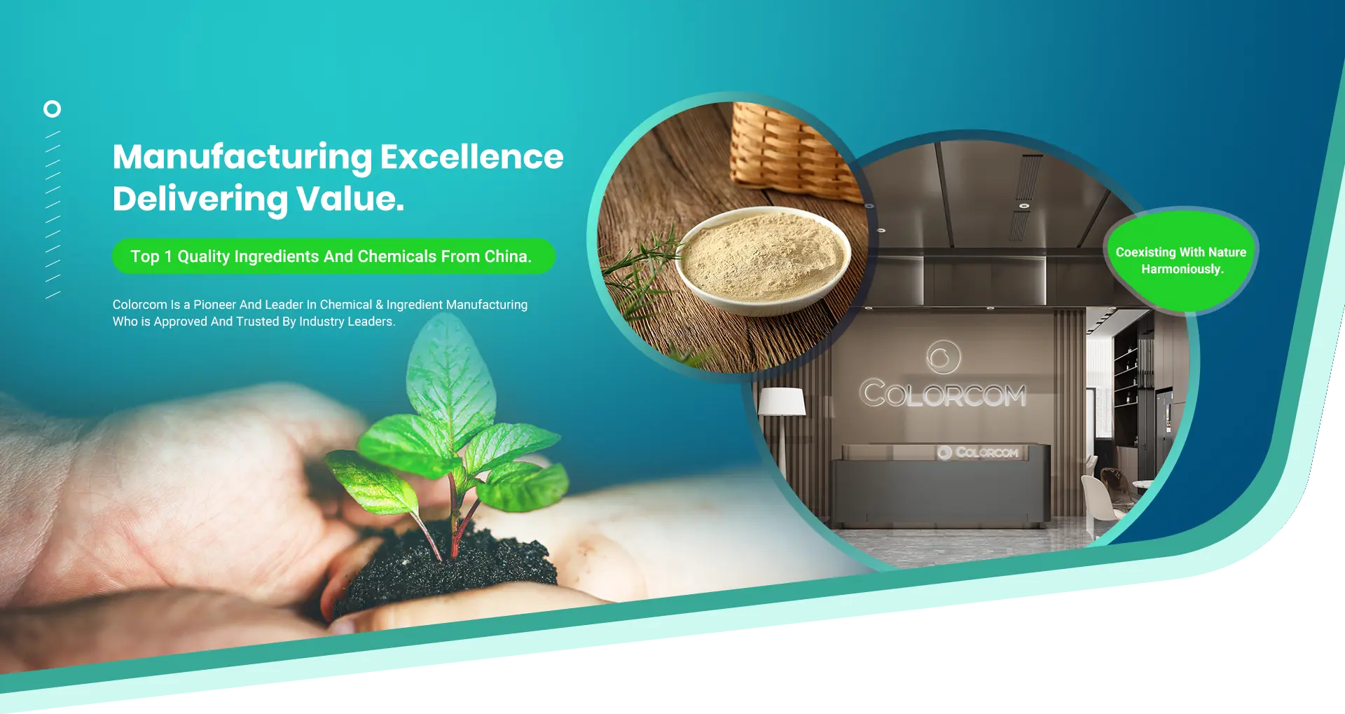Harmonické soužití s přírodou: Jedna Země, jedna rodina, jedna budoucnost. Všechny výrobní závody společnosti Colorcom se nacházejí v chemickém parku na státní úrovni a všechny naše továrny jsou vybaveny nejmodernějšími zařízeními, která jsou všechna mezinárodně certifikována. To umožňuje společnosti Colorcom nepřetržitě vyrábět produkty pro naše globální klienty.